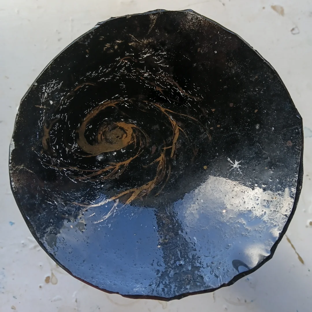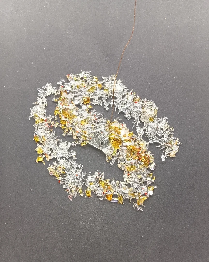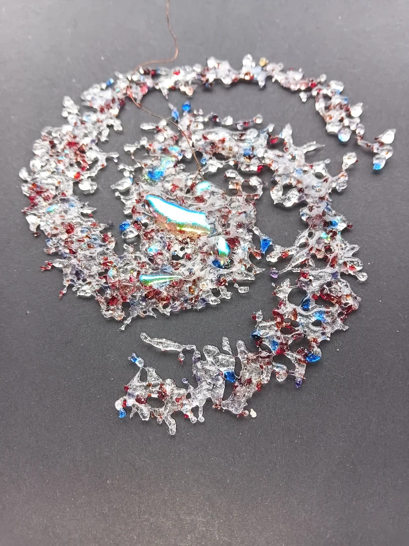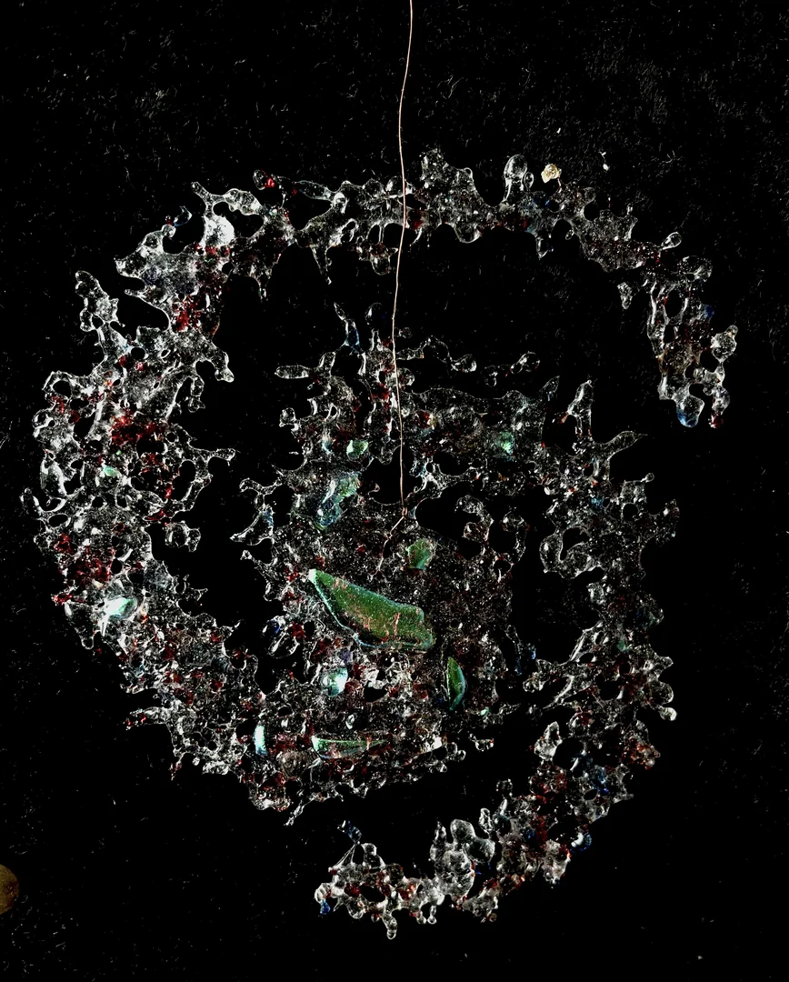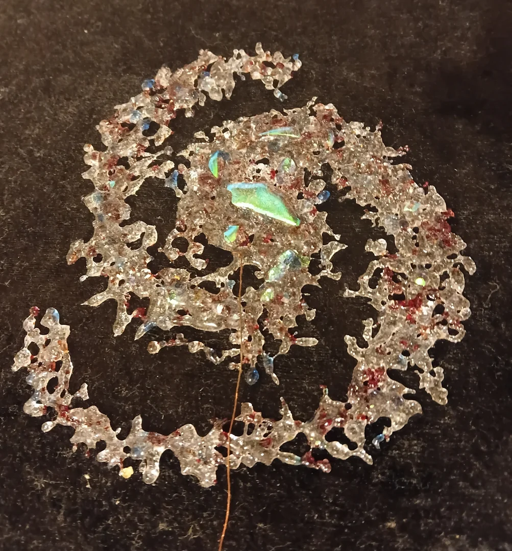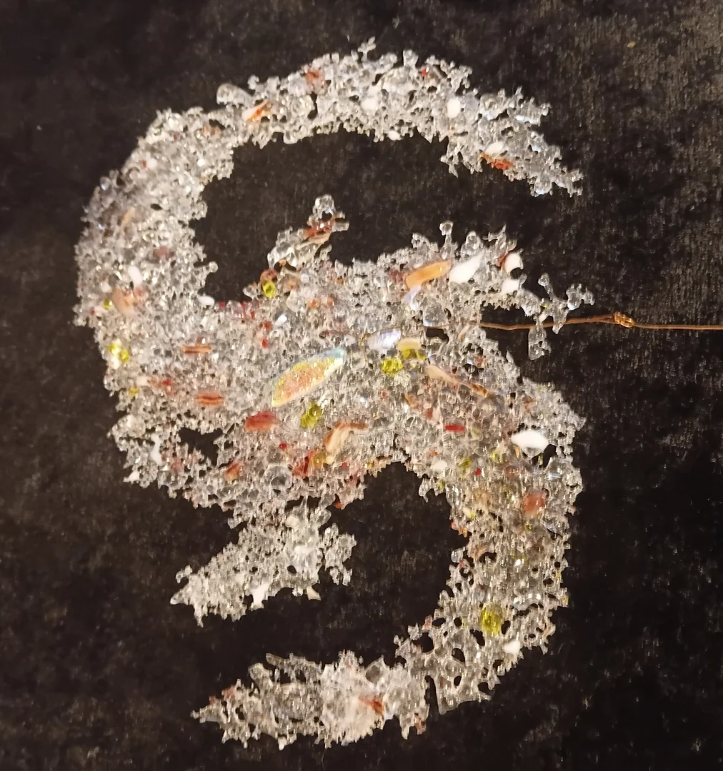Dichro and crushed glass, designed to hang at 45 degrees where they can catch the light as they rotate. Laid flat on cardboard for still images.